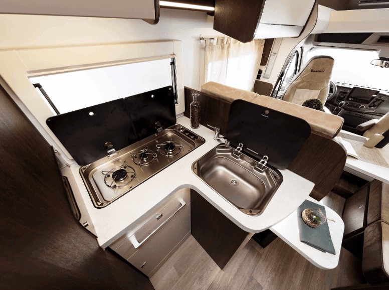 Te contamos que esta casa rodante tiene una distribución totalmente optimizada para conseguir una mayor sensación de espacio dentro del propio vehículo. La cocina, el baño y el espacio de almacenamiento en pensados para un máximo de 5 pasajeros por lo que todo el mundo tendrás su espacio viajando. Por otro lado, creemos que es importante mencionar que la cocina también está totalmente equipada.