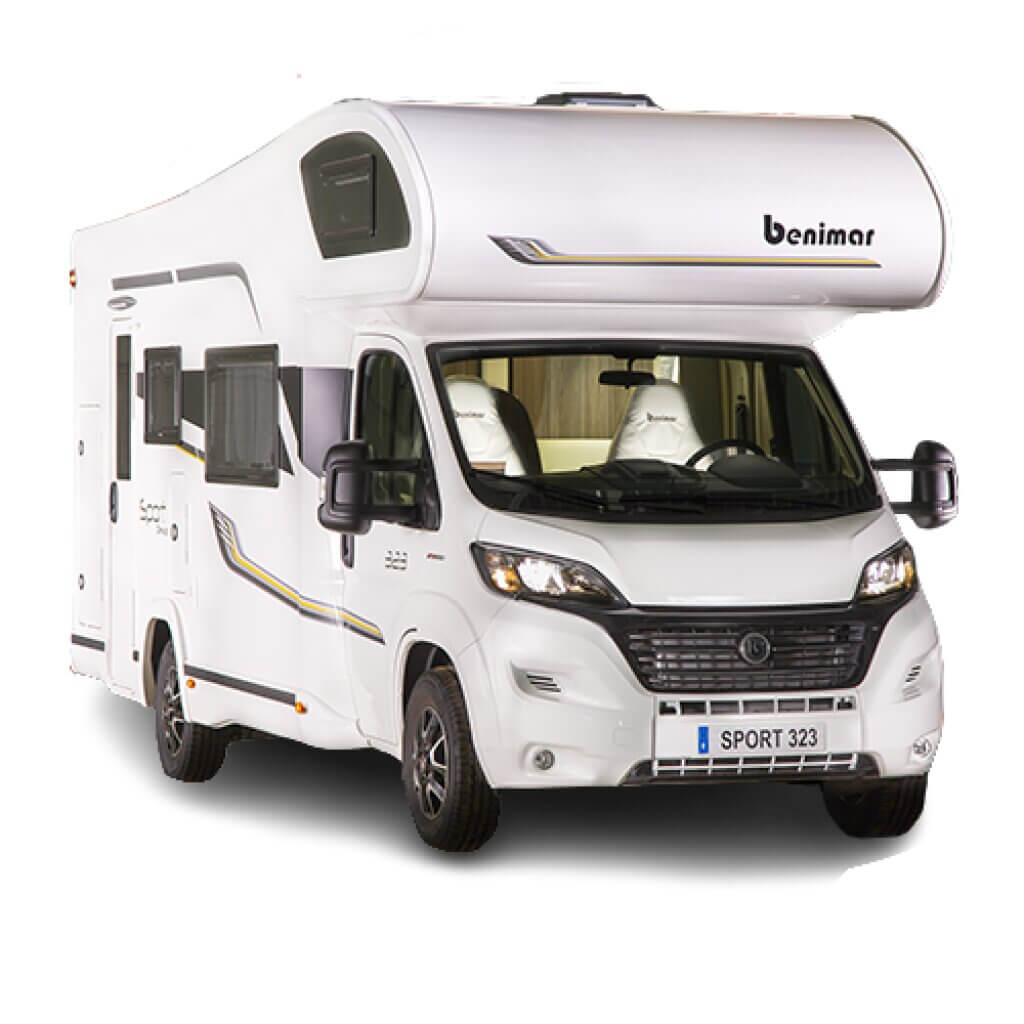 Alquiler de Autocaravana en Guipúzcoa. Esta Benimar Sport 323 capuchina es un vehículo de 7 plazas, con 2 salones y literas transversales, ideal para familias numerosas que hará que sus viajes sean más cómodos, con su amplitud interior y con solo 6,91 m. de largo.