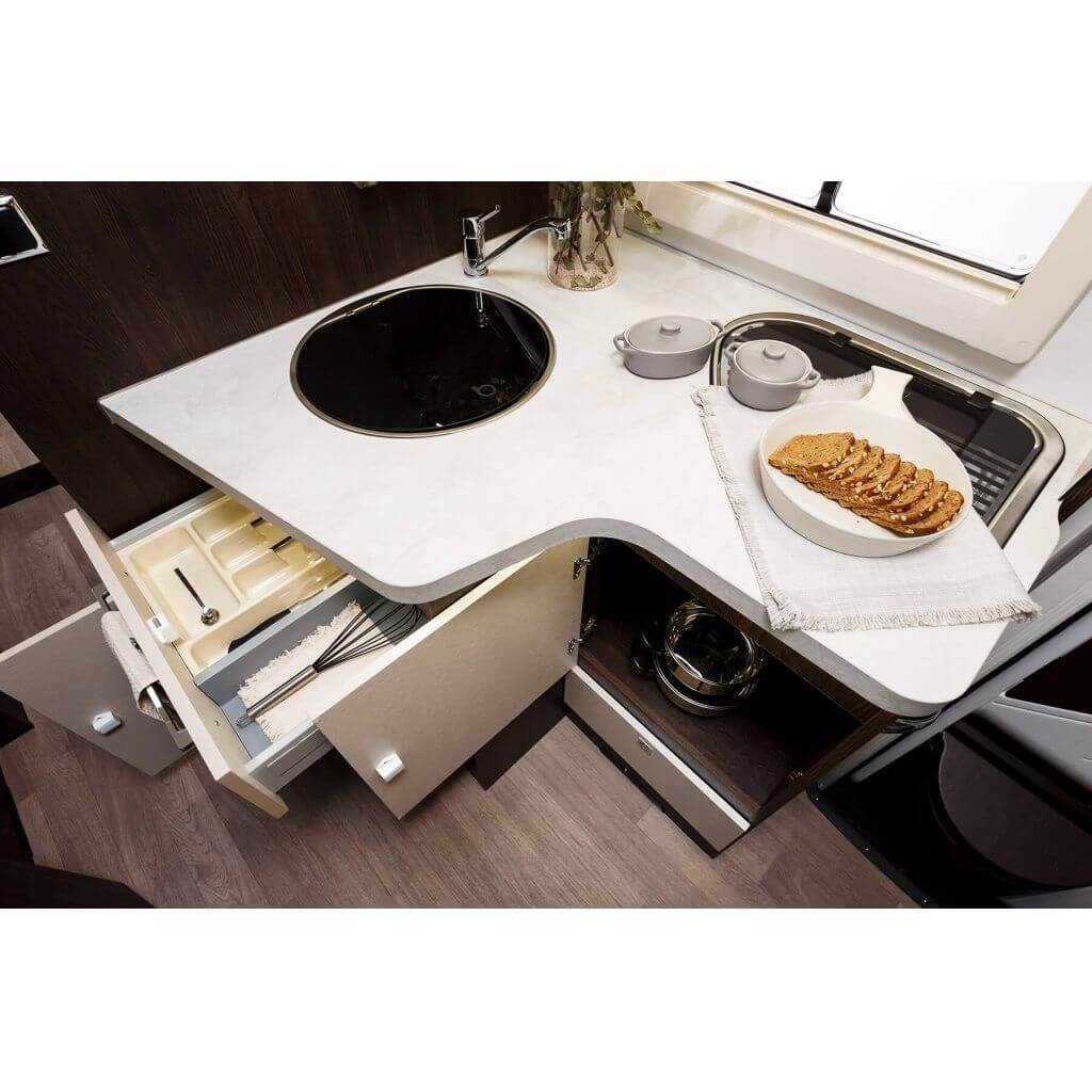 Y para terminar con su distribución, dispone de cama para 2 personas en capuchina sobre cabina, que además se puede abatir para un mejor paso a la cabina desde habitáculo. En cuanto al almacenaje se refiere, cuenta con un armario ropero de gran dimensión, altillos superiores en el salón y una bodega exterior de gran capacidad bajo literas con 2 portones laterales. ¿Qué más se puede pedir?