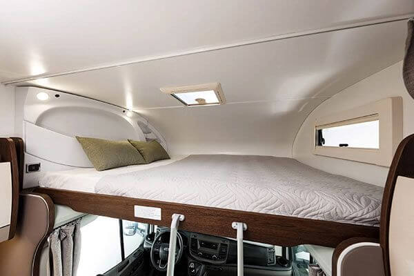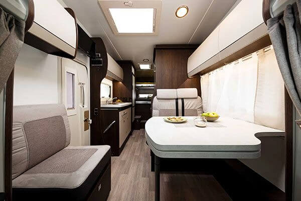 Alquiler de Autocaravana en Girona. La Autocaravana capuchina Benimar Sport UP 340, cuneta con 5 plazas con 160cv, dispone de 2 camas dobles y 1 individual con litera transversal regulable. La nevera es grande con congelador individual y mesa del comedor atendible con asientos rodables para comer en grupo.