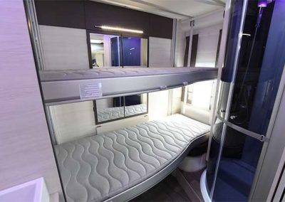 - 2 literas: Situadas en la parte posterior de la autocaravana, las camas se pliegan en la parte superior dejando espacio para el segundo comedor con su mesa plegable en la pared.