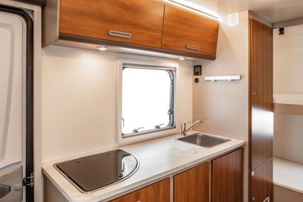 - Módulo de cocina Dometic de 2 fuegos con piezo-eléctrico y fregadero de un seno integrado.