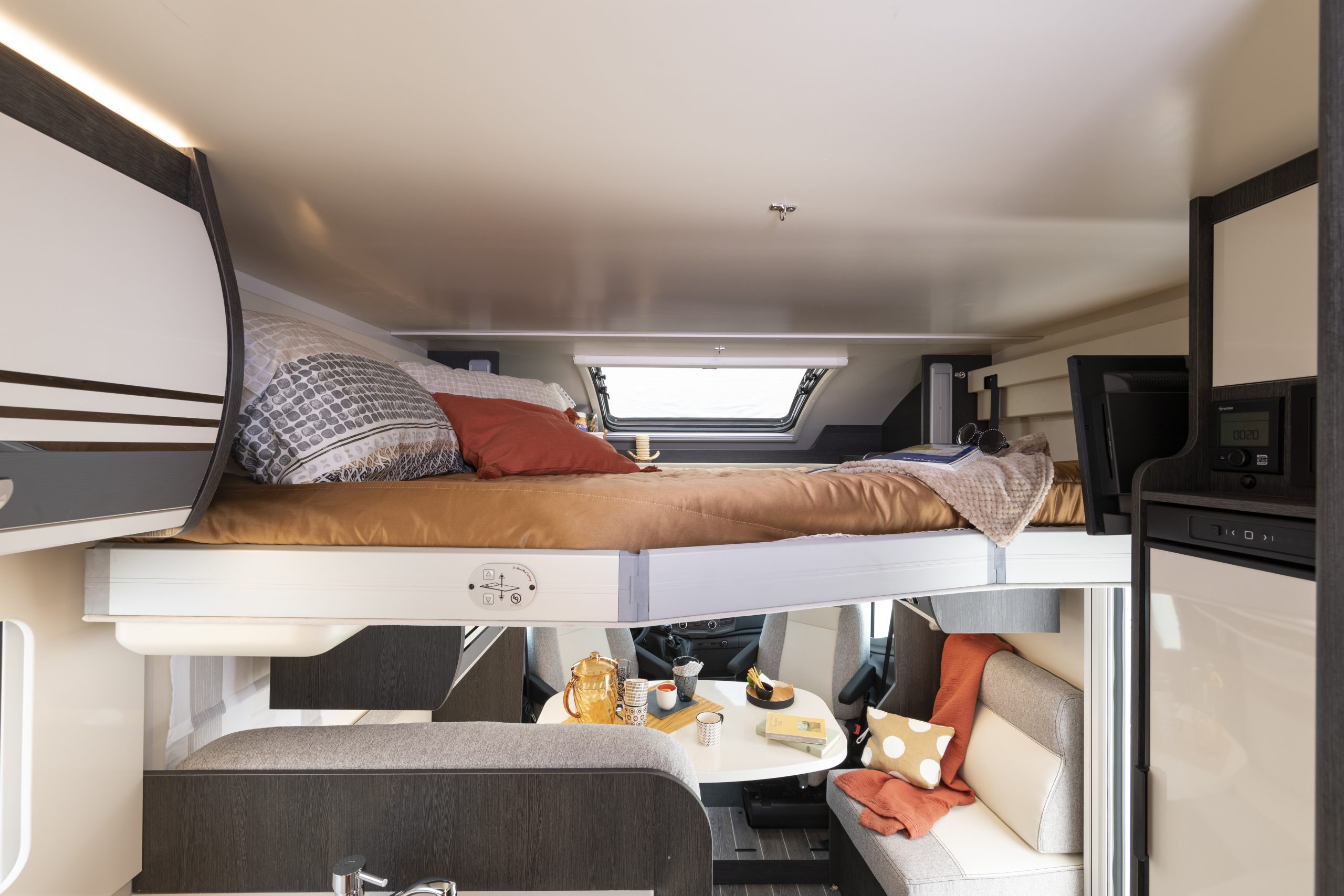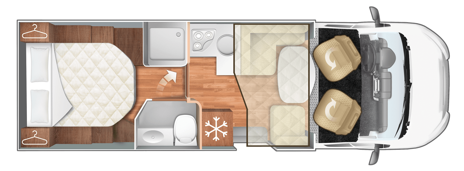 Alquiler en Logroño. La Autocaravana perfilada nueva, KRONOS 265TL de 7,430m de largo. Dispone de 1 cama isla de matrimonio en la parte trasera, 1 cama de matrimonio basculante y otra cama individual en el comedor.