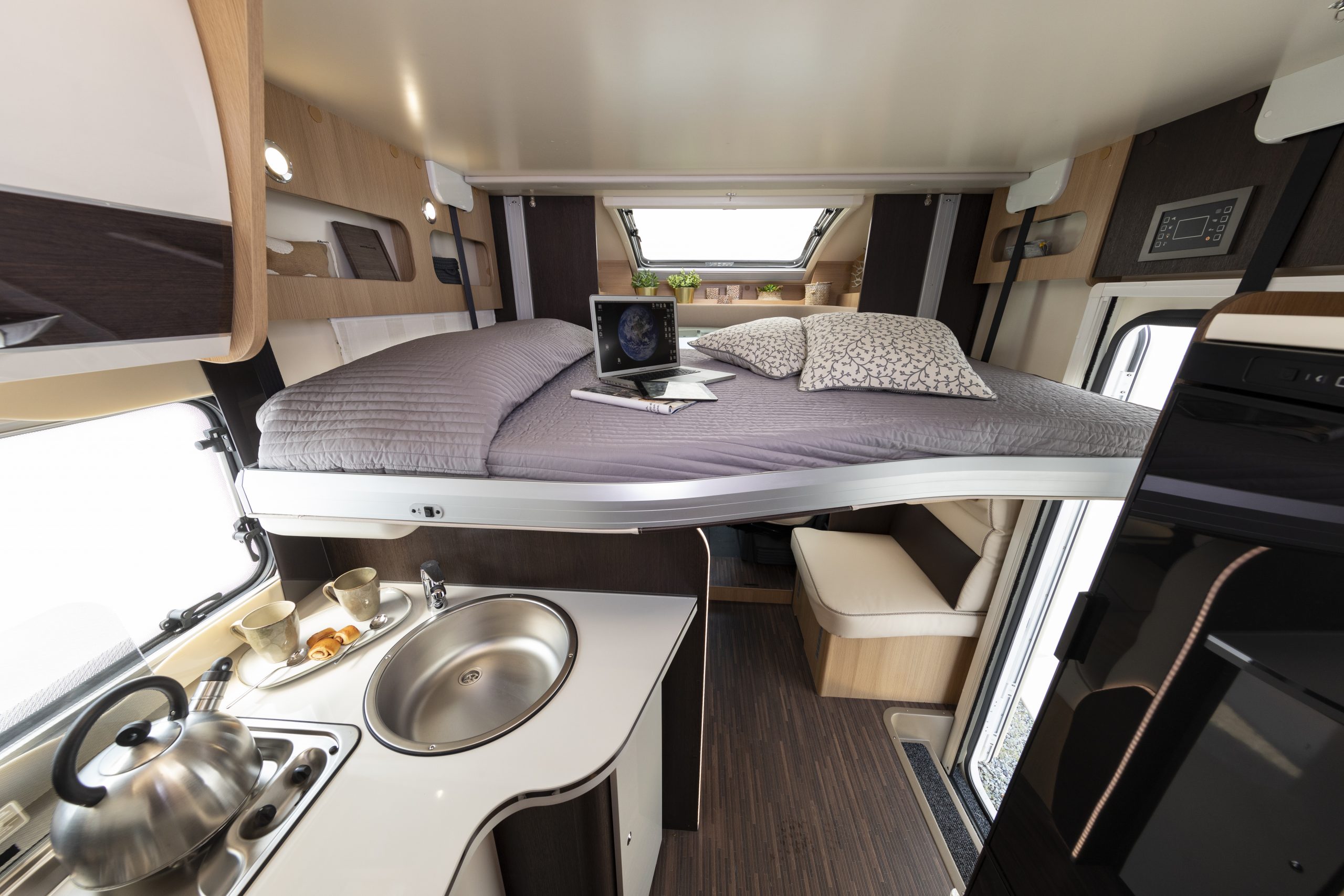 También, incluye una cama extra doble basculante, ideal para niños. Cuenta con cocina equipada, amplio salón, una gran nevera y un aseo completo. Además, de disponer de un amplio maletero ideal para guardar bicis, elementos de kitesurf, windsurf… o hacer grandes viajes en familia.