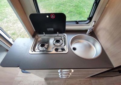 En cuanto a la cocina, cuenta con una ampliación de la encimera para tener un mayor espacio y, por lo tanto una mayor comodidad, un frigorífico que dispone de selección automática de energía y doble puerta, fregadero de acero inoxidable y cocina de acero inoxidable de 2 fuegos con tapa de vidrio. Dispone de dos camas gemelas convertibles en una cama XXL con armarios al pie de la cama. Además, para ofrecer una mayor privacidad dispone de doble separación espacio día/noche.