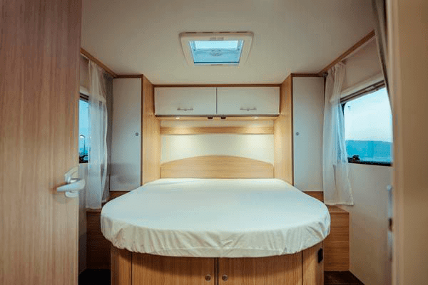 Autocaravana perfilada con cama doble en isla de 150 x 190 cm en la parte trasera, y otra cama doble abatible de 140 x 195 cm situada sobre el salón.
