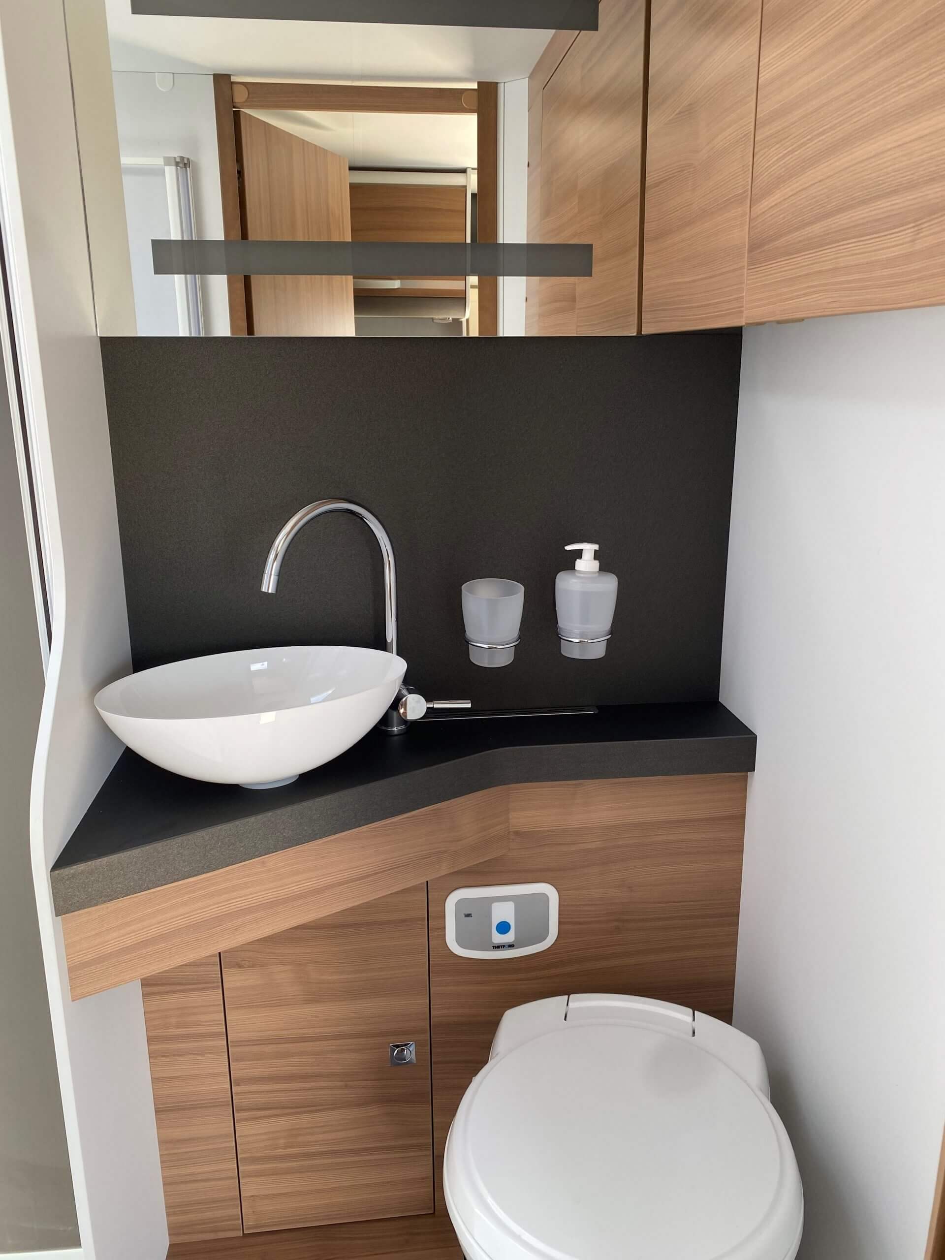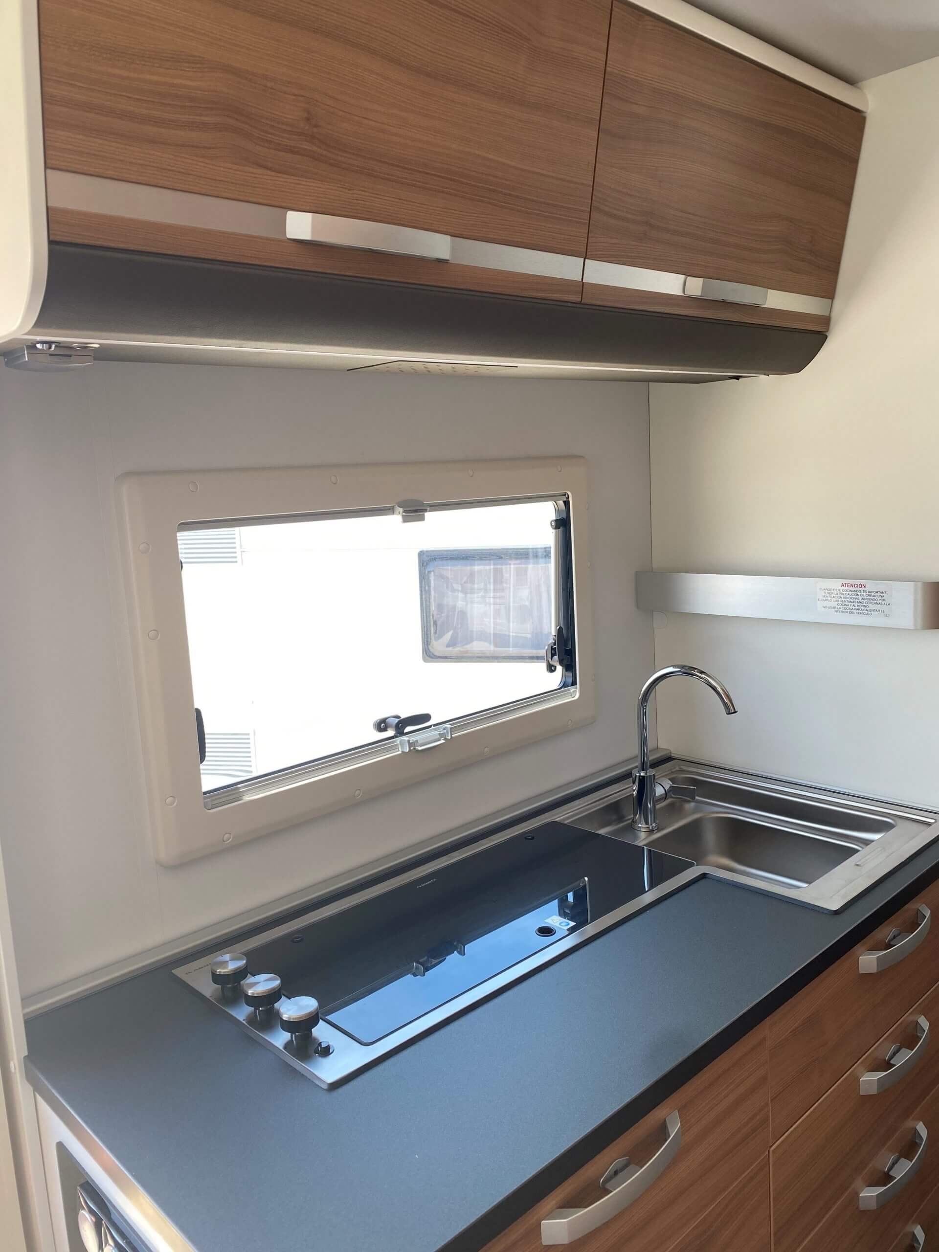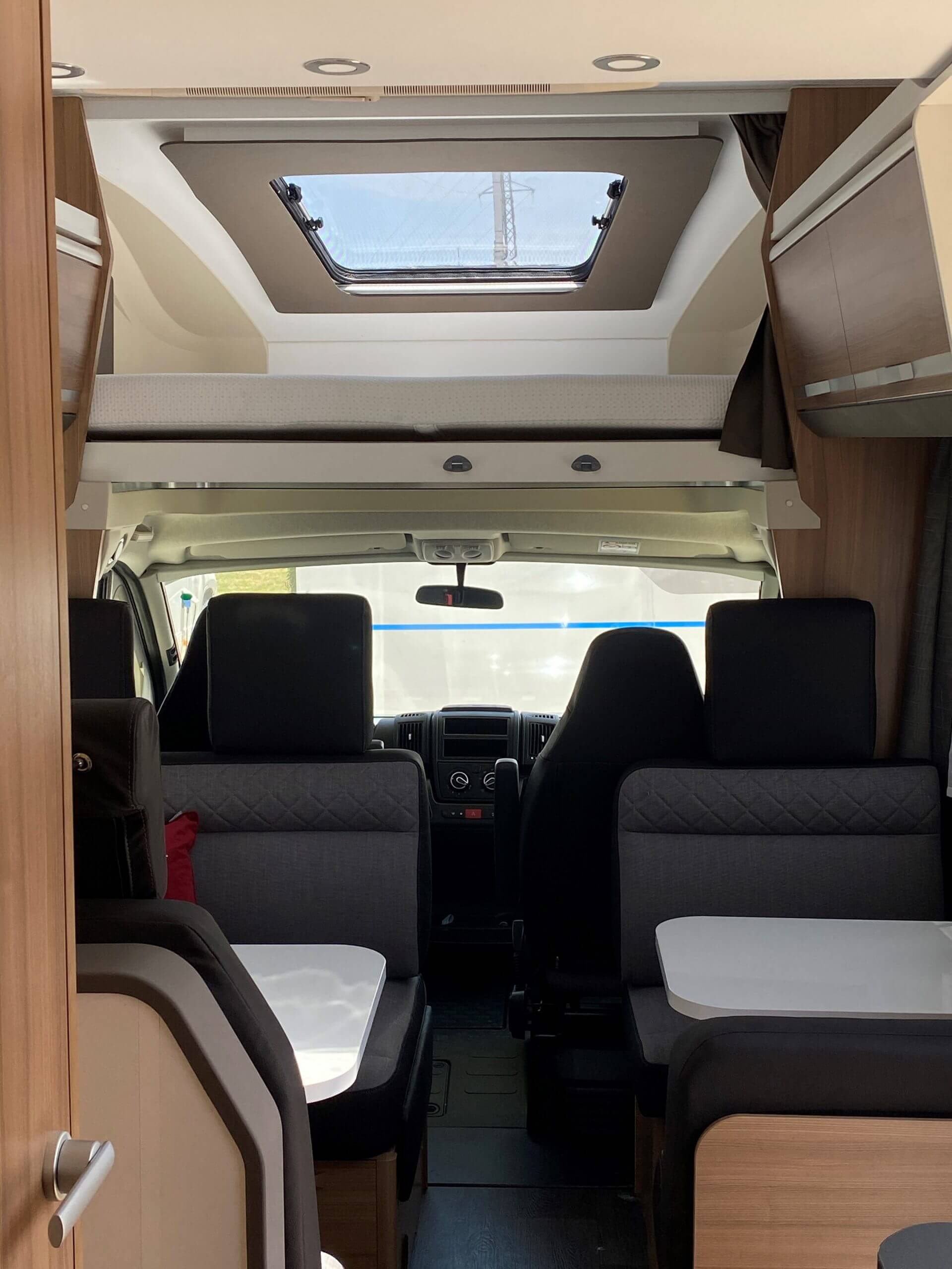 Alquila la capuchina con literas Adria Coral XL DK. Distribución con dos comedores de doble banqueta, cama fija sobre cabina, literas y aseo con plato de ducha separada.