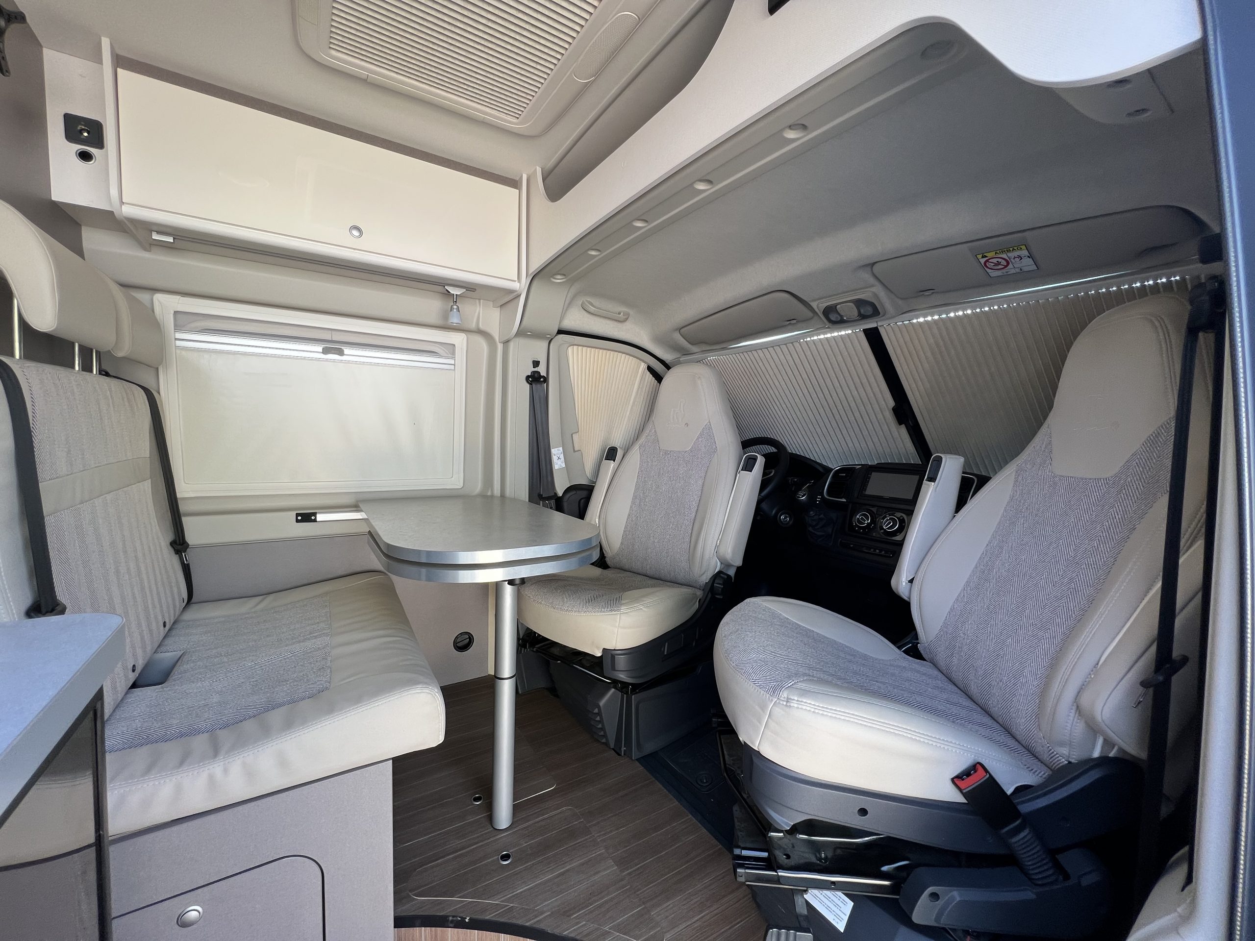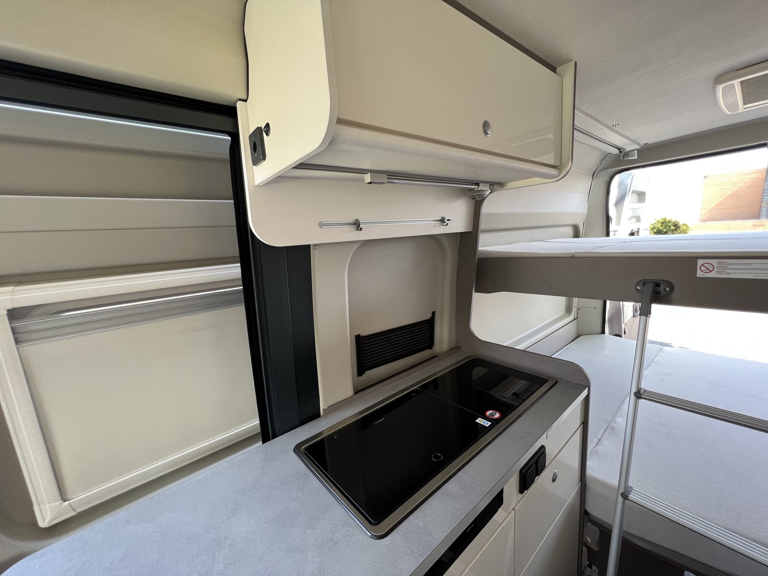 Nos encontramos con una camper que dispone de doble cama de matrimonio transversal en la zona trasera, las cuales podremos abatir para poder guardar todo lo que necesitemos (bicis, esquís…) y hasta utilizarlo de maletero para el día a día. Además tenemos un baño completo, cocina con una amplia nevera, salón convertible en cama y dispone de un buen espacio de almacenaje que nos encantará aprovechar en todos nuestros viajes.