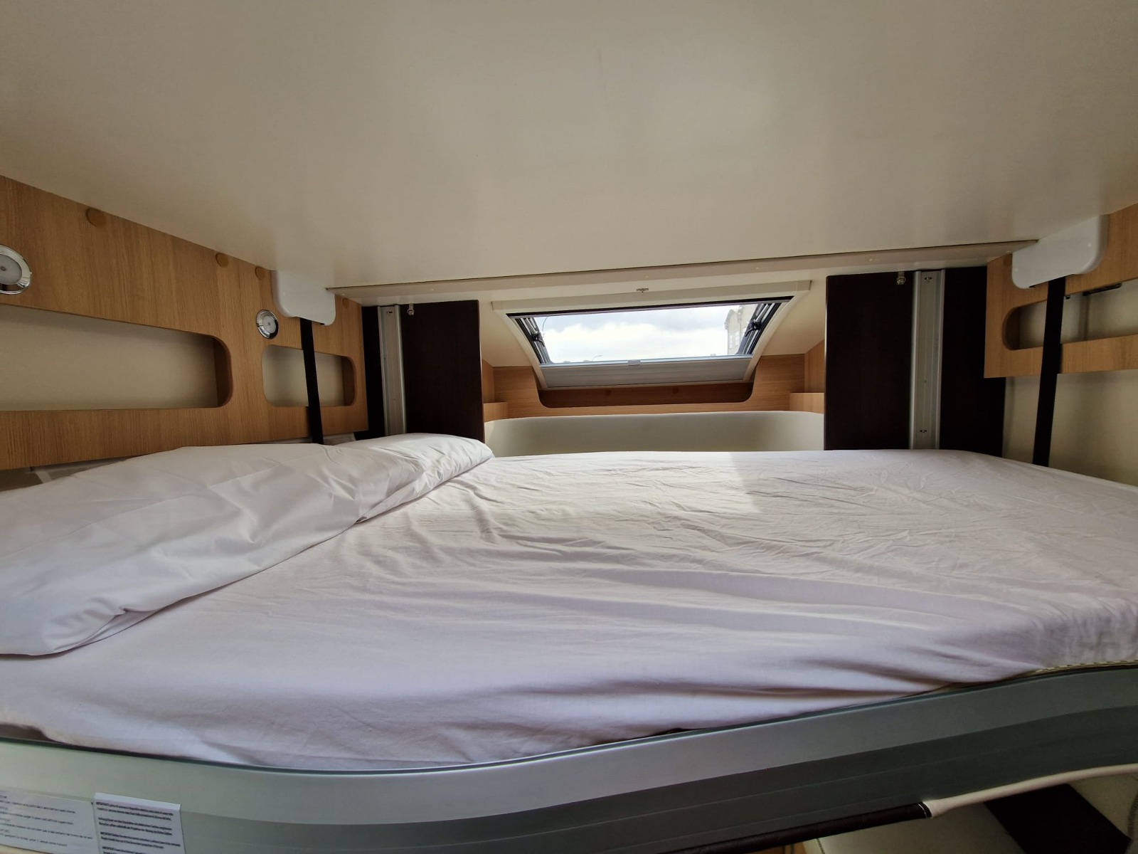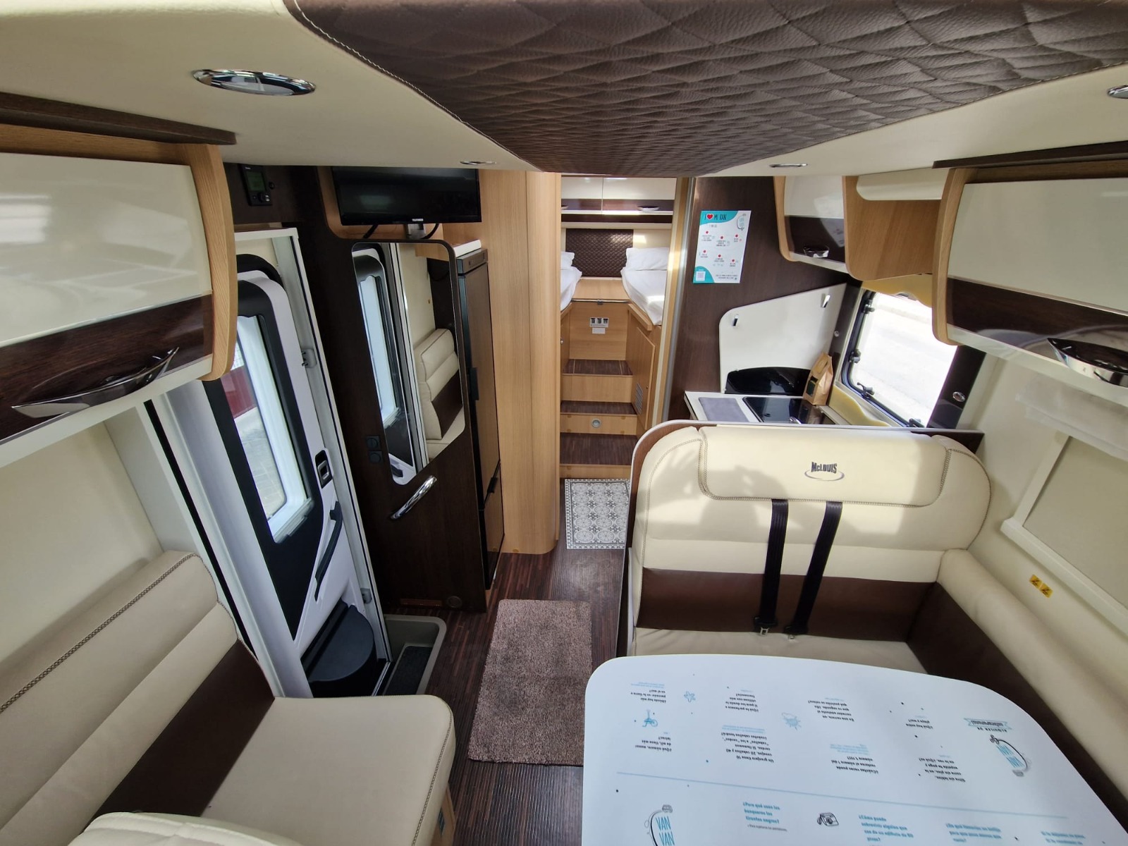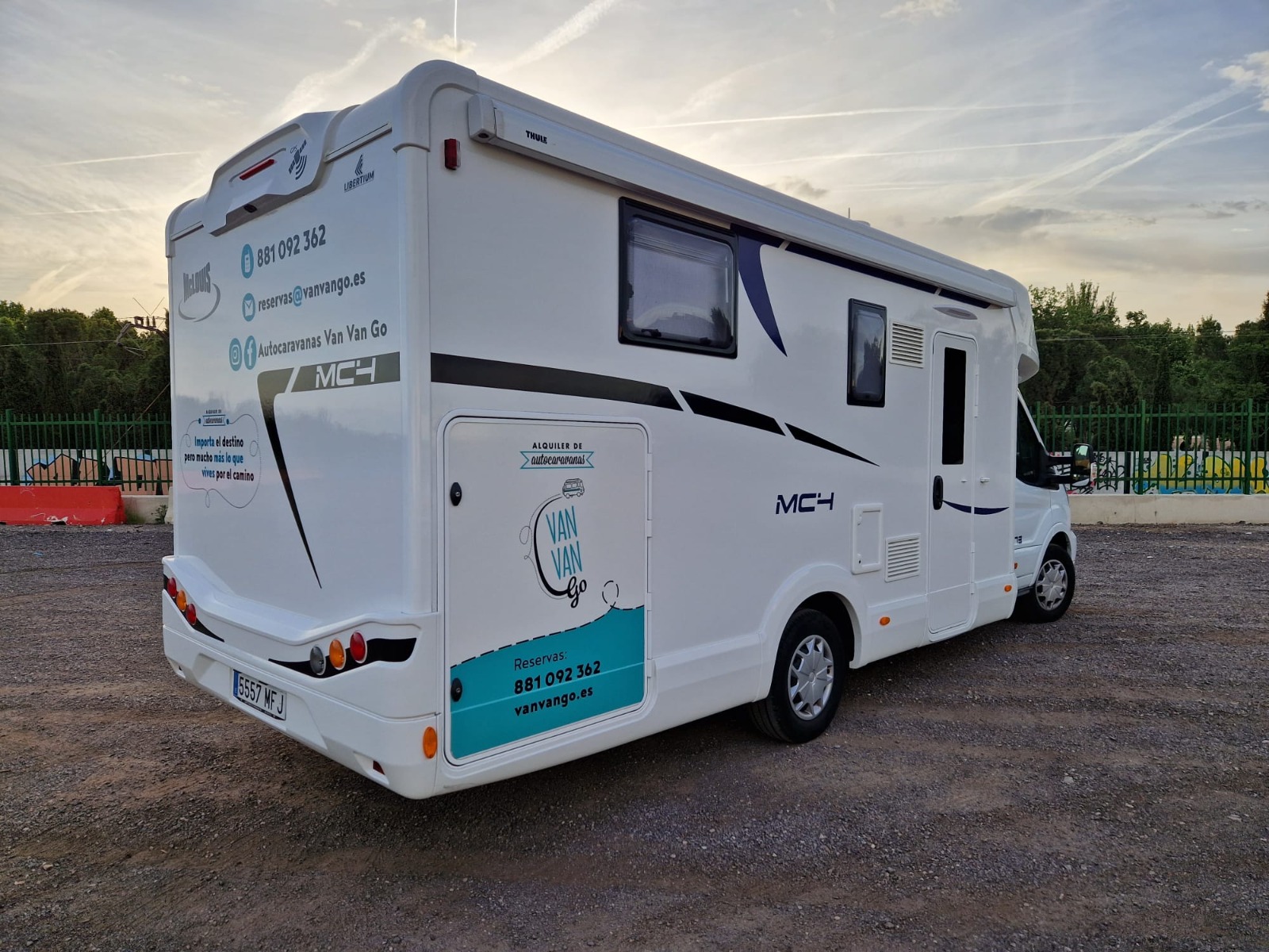 Autocaravana perfilada McLouis MC4 373 en Madrid de 5 plazas para dormir y para viajar. Dispone de un dormitorio independiente en la parte posterior con dos camas gemelas transformables en una gran cama de 182×212 cm y otra cama de matrimonio basculante sobre la sala. Además, cocina de tres fuegos, fregadero, nevera de 150l, zona del comedor con amplia mesa, asientos delanteros giratorios y TV, cuarto de aseo con WC, lavabo y plato de ducha independiente. Gran Bodega de almacenaje. ¡Alquila ya con Van Van Go!