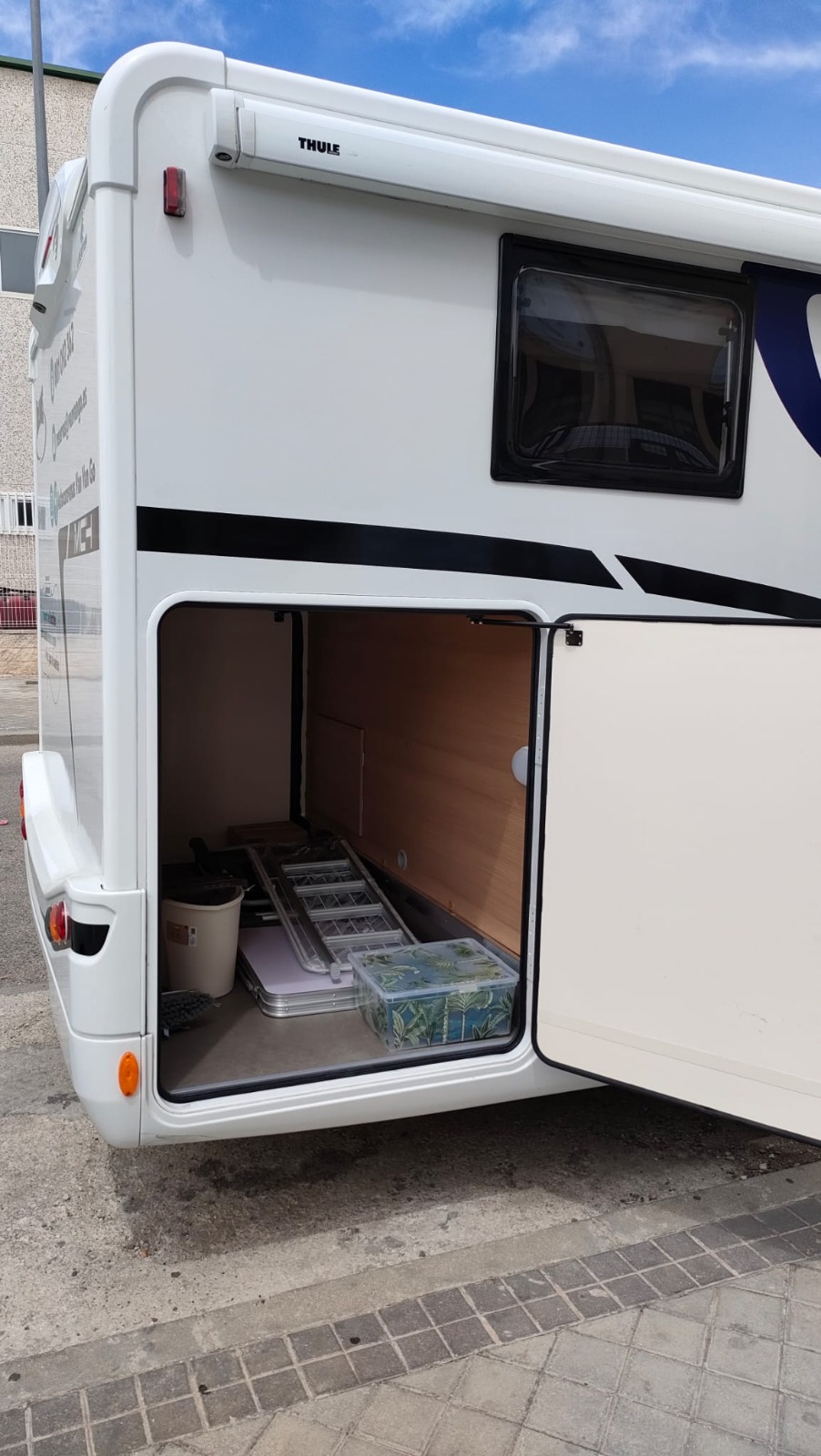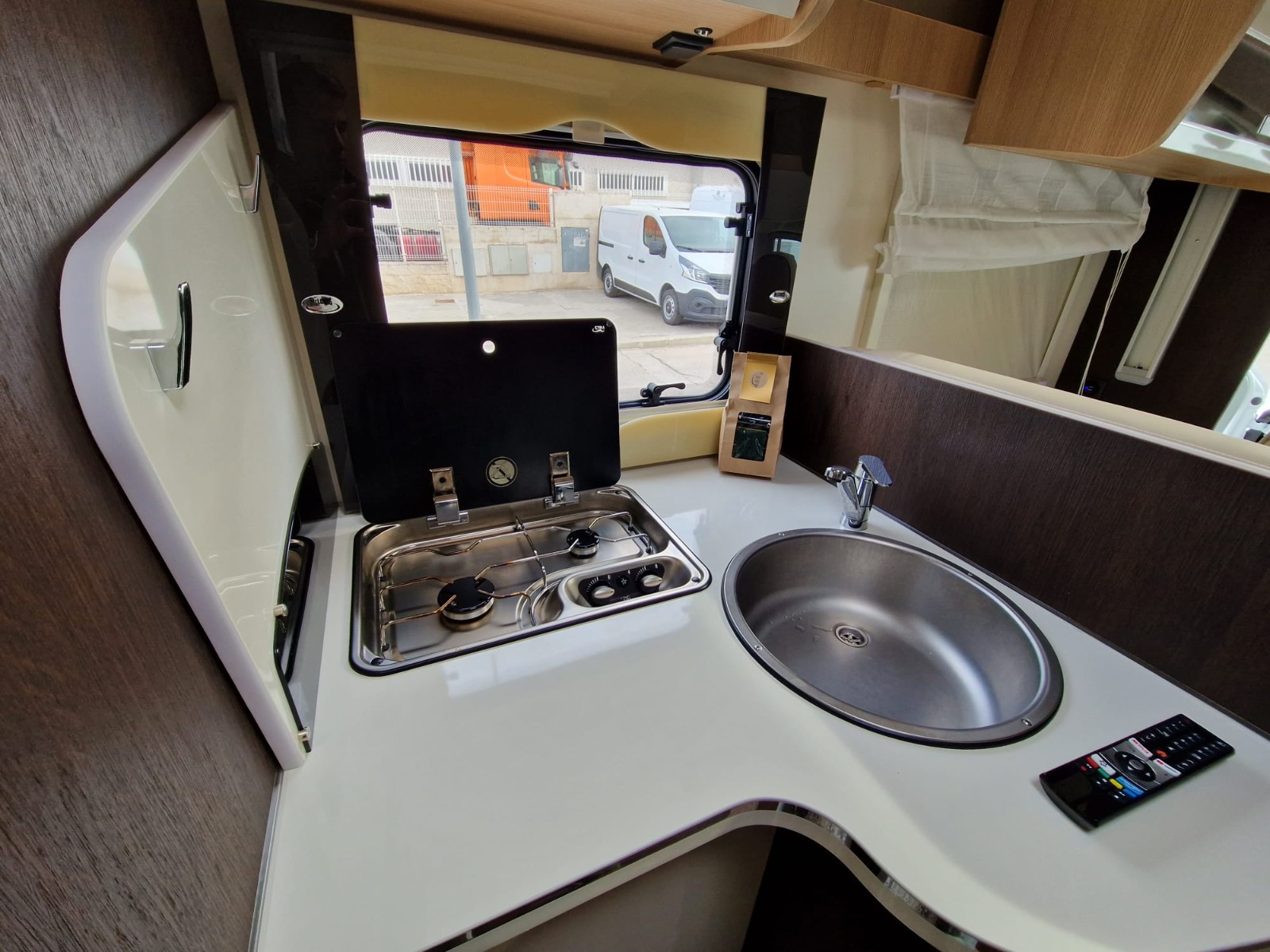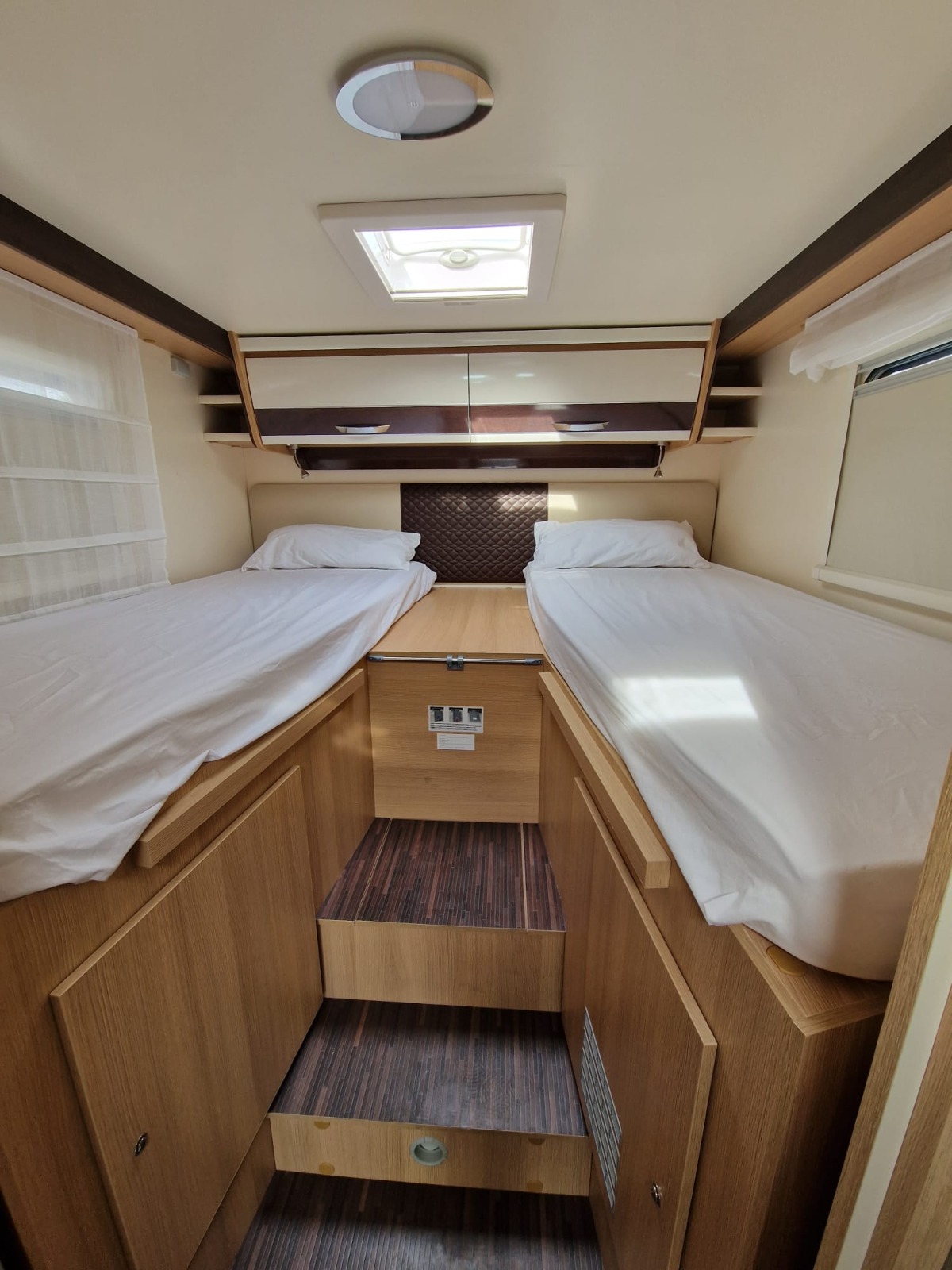 Autocaravana perfilada McLouis MC4 373 en Madrid de 5 plazas para dormir y para viajar. Dispone de un dormitorio independiente en la parte posterior con dos camas gemelas transformables en una gran cama de 182×212 cm y otra cama de matrimonio basculante sobre la sala. Además, cocina de tres fuegos, fregadero, nevera de 150l, zona del comedor con amplia mesa, asientos delanteros giratorios y TV, cuarto de aseo con WC, lavabo y plato de ducha independiente. Gran Bodega de almacenaje. ¡Alquila ya con Van Van Go!