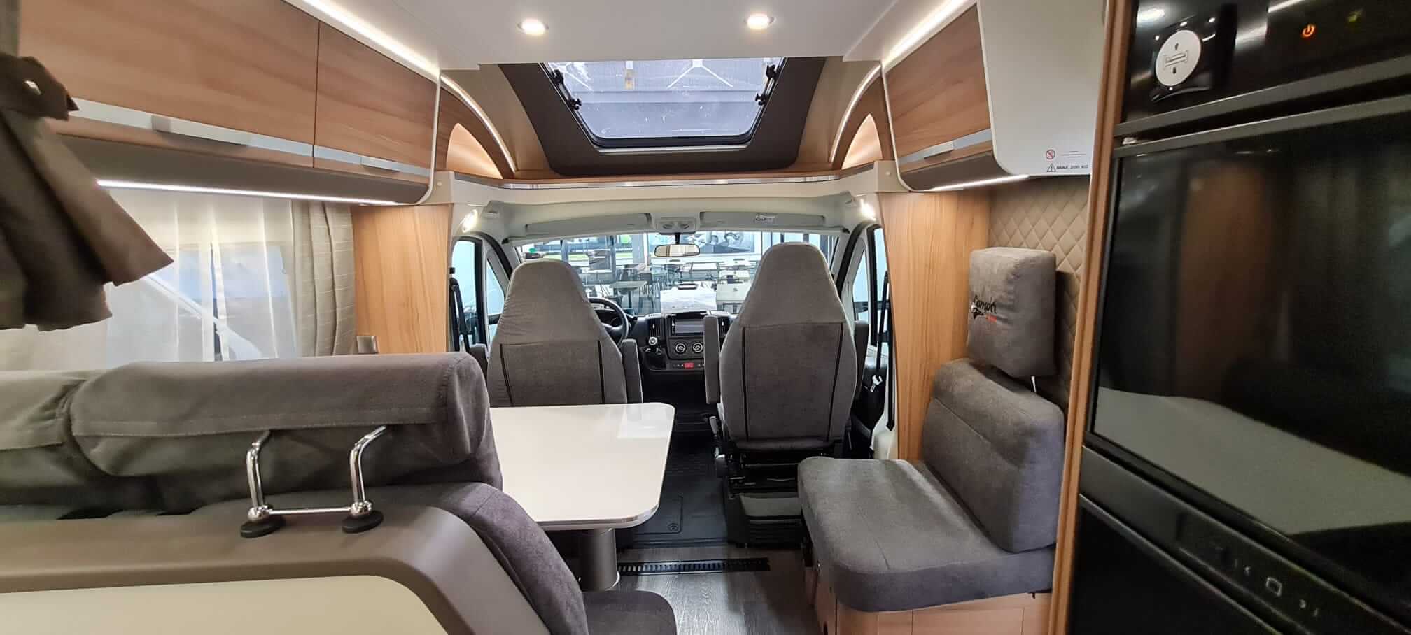 Alquila la perfilada Matrix 670 SL. Distribución con comedor con asientos giratorios, cama basculante sobre comedor, camas gemelas sobre garaje, aseo con plato de ducha separada.