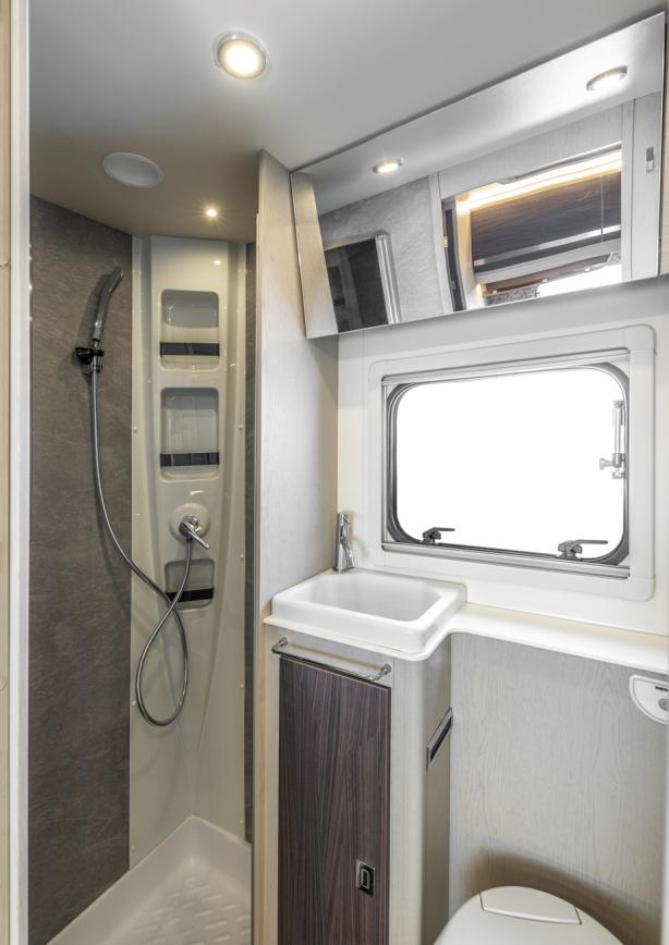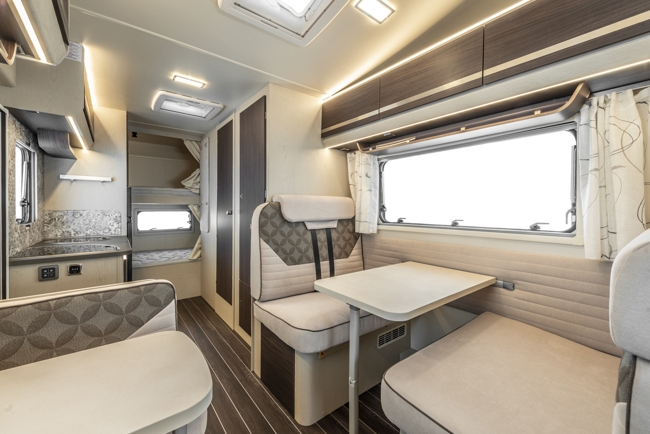 La distribución se compone por dos salones, transformables en una cama de matrimonio y en un cama individual. Encima de la cabina tenemos la cama alcoba.  En la parte trasera tenemos las literas, especialmente pensadas para niños.