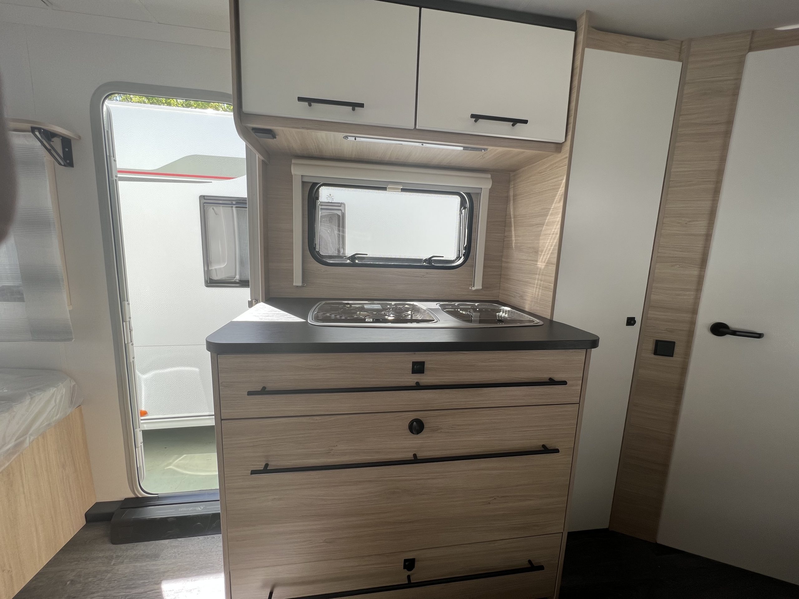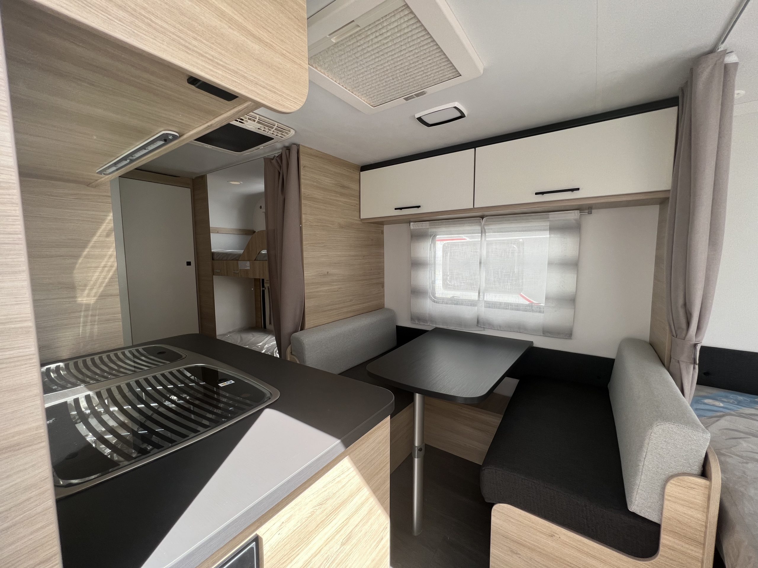 Se trata de una caravana ligera y fácil de remolcar, es uno de los modelos más completos del mercado! Propone la distribución más demandada en nuestro mercado de caravanas de Madrid. Dispone unas literas en la zona trasera a lo largo y con la litera inferior abatible e incluye un portón exterior para poder almacenar desde el fuera bicis, mesas, sillas…, amplio salón convertible sencillamente en una cama de matrimonio, más otra amplia cama de matrimonio fija y un espacio de vida agradable, amplio y luminoso formado por una cocina con encimera y baño completo…No se la pierda, los preciosos acabados y los diferentes textiles la hacen única, y además lleva incluido…