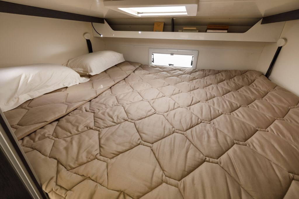 Venta en Logroño. La Autocaravana capuchina Kronos 290M de 5 plazas. Año 2022. Dispone de 1 cama de matrimonio transversal en la parte trasera, 1 cama de matrimonio encima de la cabina y otra cama individual en el comedor.