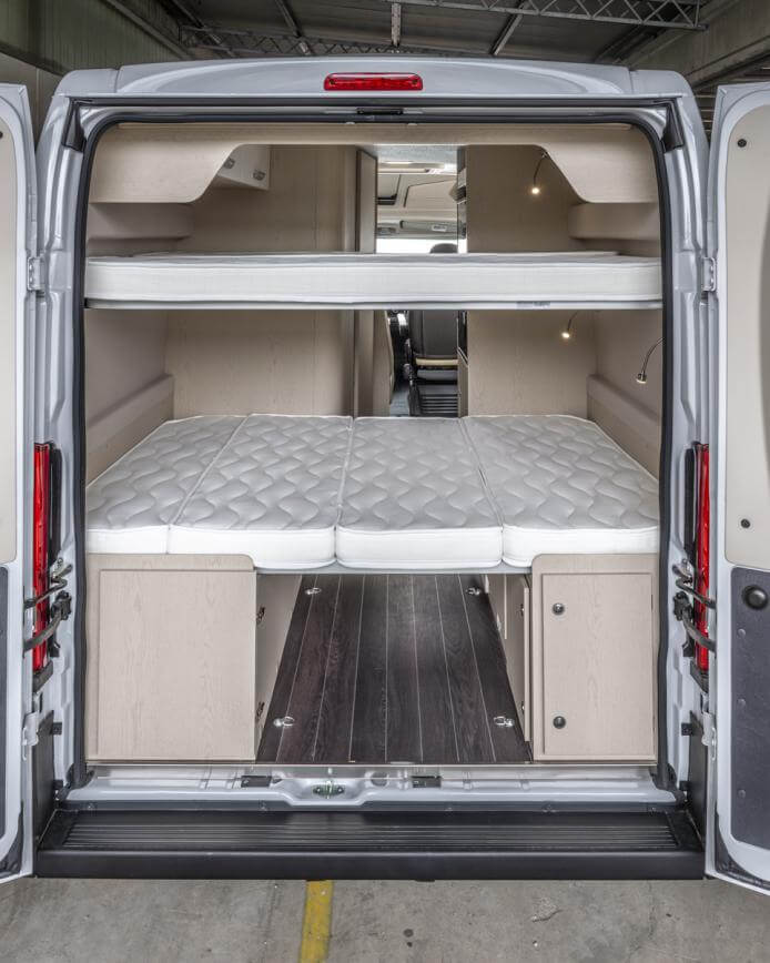 Venta en Madrid. La HORUS 145, sigue siendo nuestra camper por excelencia, antigua HORUS45, en 6 metros tienes todas las comodidades para viajar 4 personas, cama doble y dos literas, cuarto de baño con ducha, asientos giratorios, gran almacenaje interior. Ideal para 2 o 4 personas, tú eliges si poner o quitar las literas.