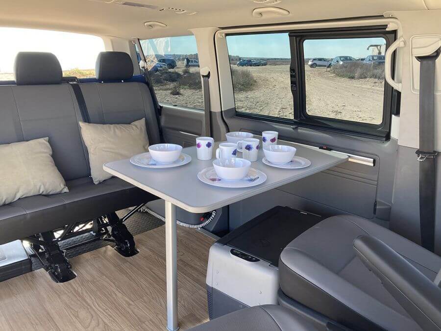 Venta en Alicante. El VW T6.1 ARIZONA modelo 2022 posee todas las comodidades para tu viaje. Acabados en madera, una pequeña cocina equipada con nevera. Dispone de 4 plazas para viajar y 2 para dormir. AC en todo el vehículo y espacio de almacenamiento.