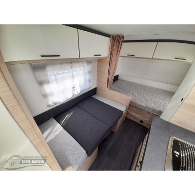 Venta en Madrid. El modelo EASY 470 PE, con camas para 6 personas, con litera para los niños, una gran nevera de serie (XL-Freeze de 150 l), sistemas de almacenamiento con armario para colgar la ropa, armario con baldas y gran puerta de 1 x 0,64 m. ¡Bienvenida, familia!